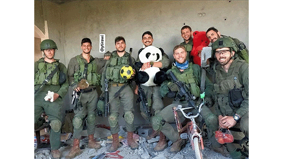 جندي يقتحم صفّاً ويحطّم شهادات التلامذة المعلّقة فوق اللوح، ويكتب عليه تهديداً بالعبرية؛ جنود يلهون على درّاجة هوائية فوق أنقاض مبنى دمّروه للتو؛ جنديان ينامان داخل سرير طفلة، غطاؤه زهري اللون؛ فلسطينيّون في الضفّة الغربية يُخطَفون على وقع أغنية للأطفال؛ وعقلٌ إباديّ ارتأى الاستعانة بأطفال إسرائيليّين لأداء أغنية إبادية تحتفي بطائراتٍ تقصف، دمارٌ دمار، انظروا إلى الجيش الإسرائيلي يتخطّى الحدود. بعد عامٍ، لن يبقى شيء هنا.